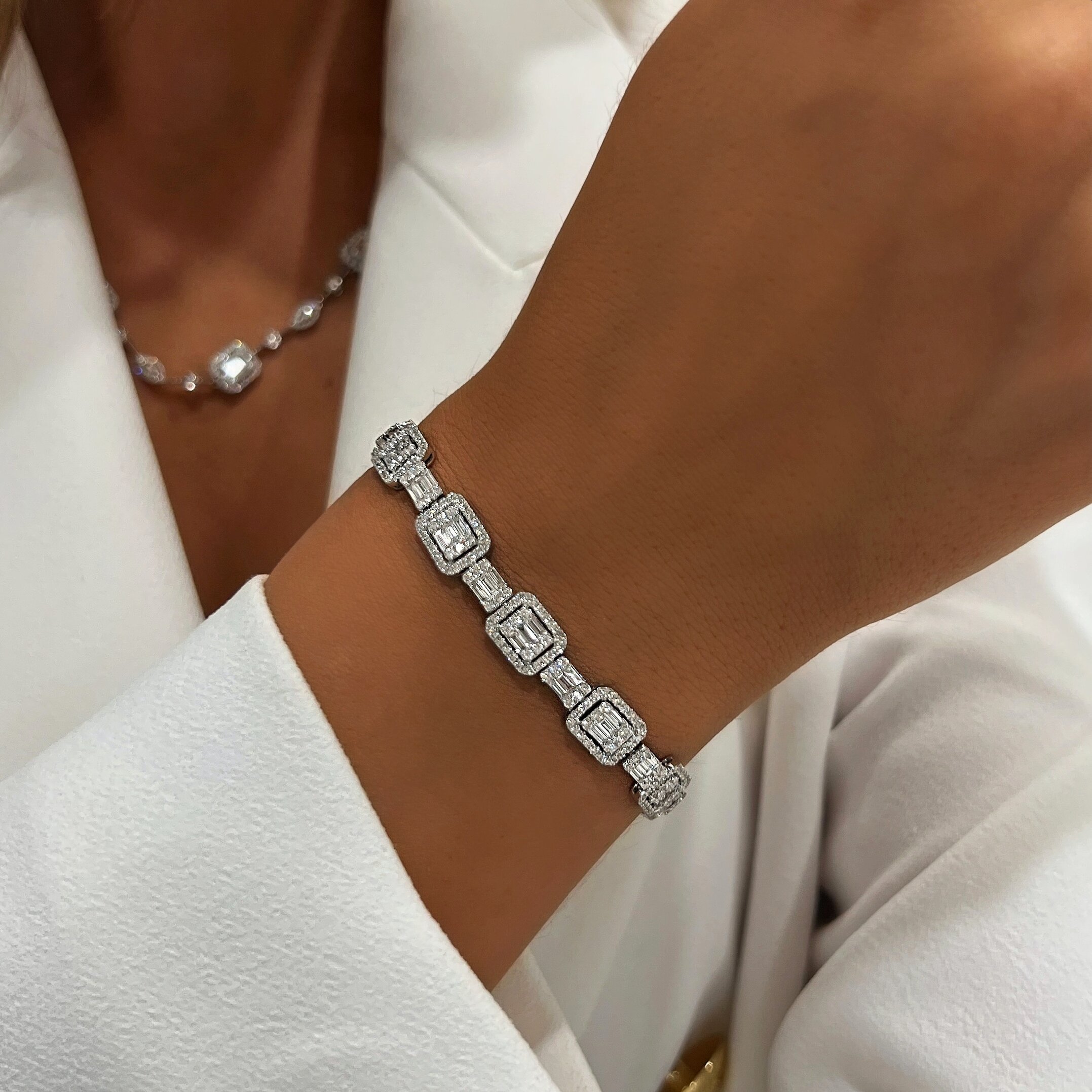 Bransoletka “Empire™” – 440 diamentów (~4.10 ct) o czystości VVS-SI i barwie G-H, oprawionych w białe złoto wysokiej próby 0.750. Arcydzieło jubilerskie od M&M GOLD z dożywotnią gwarancją.