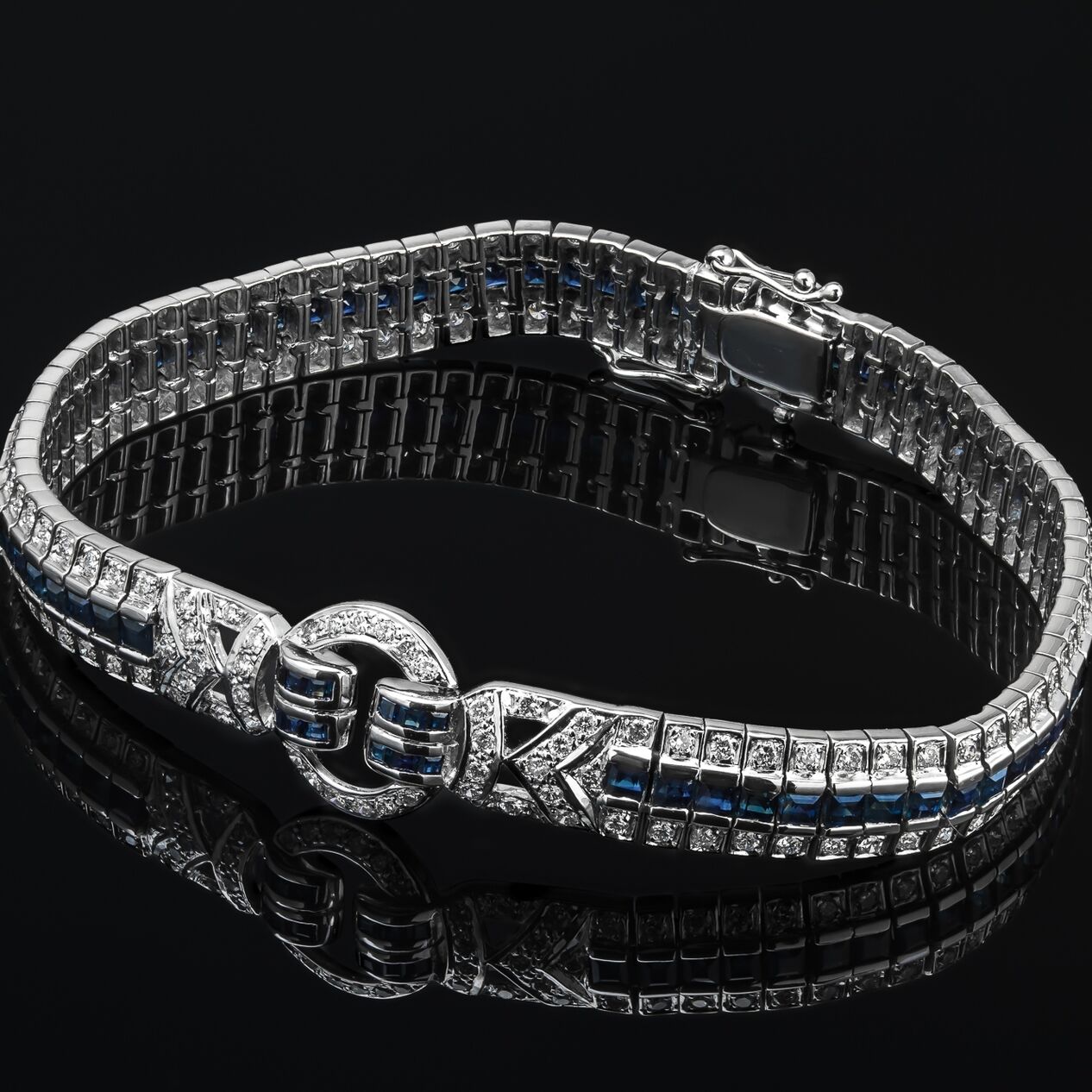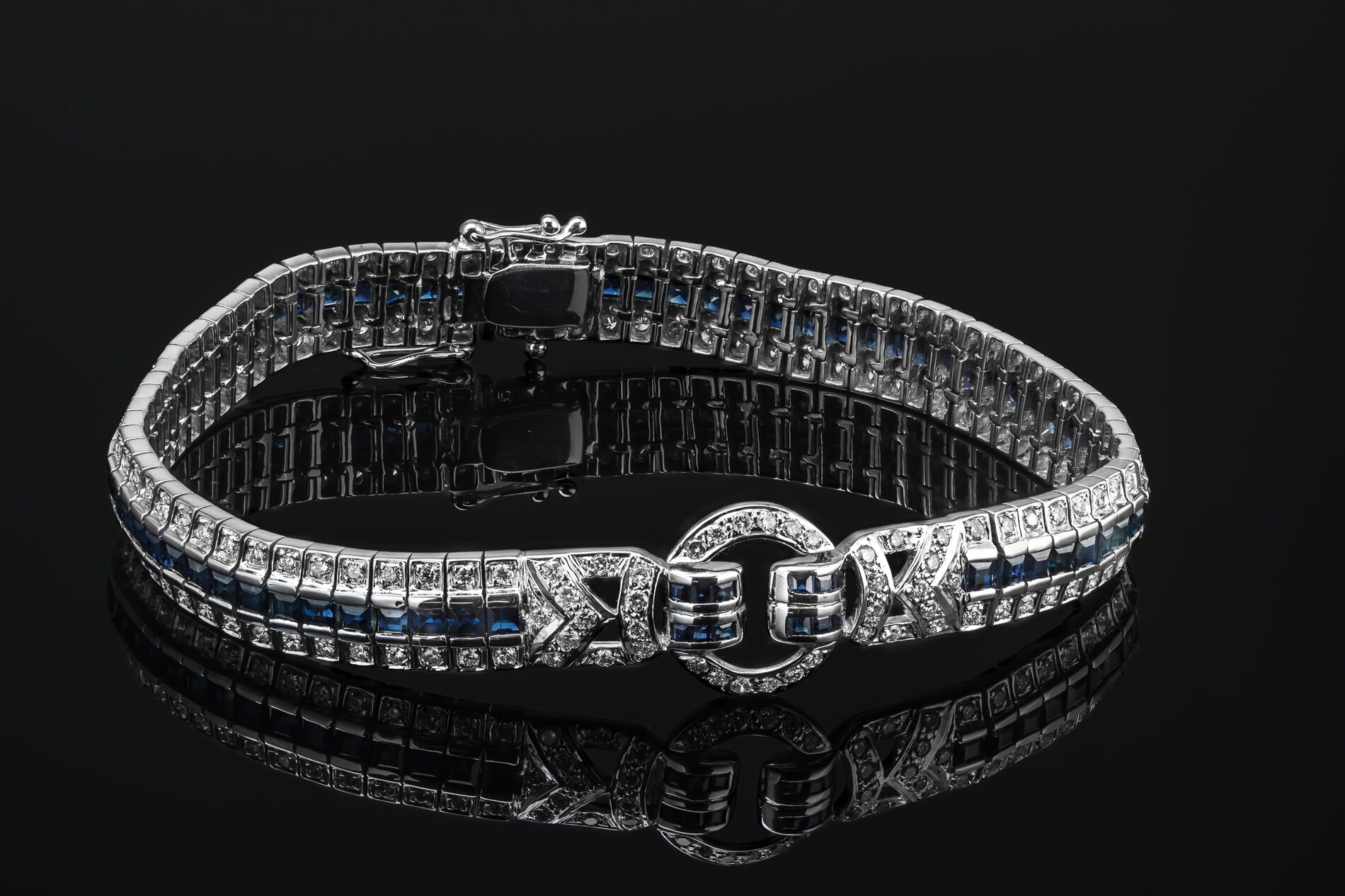 Bransoletka z białego złota 18K, zdobiona 172 brylantami (~1.80 ct) i 68 szafirami (~3.00 ct). Uniwersalne piękno i inwestycyjna wartość zamknięte w luksusowym projekcie o masie 23.26g.