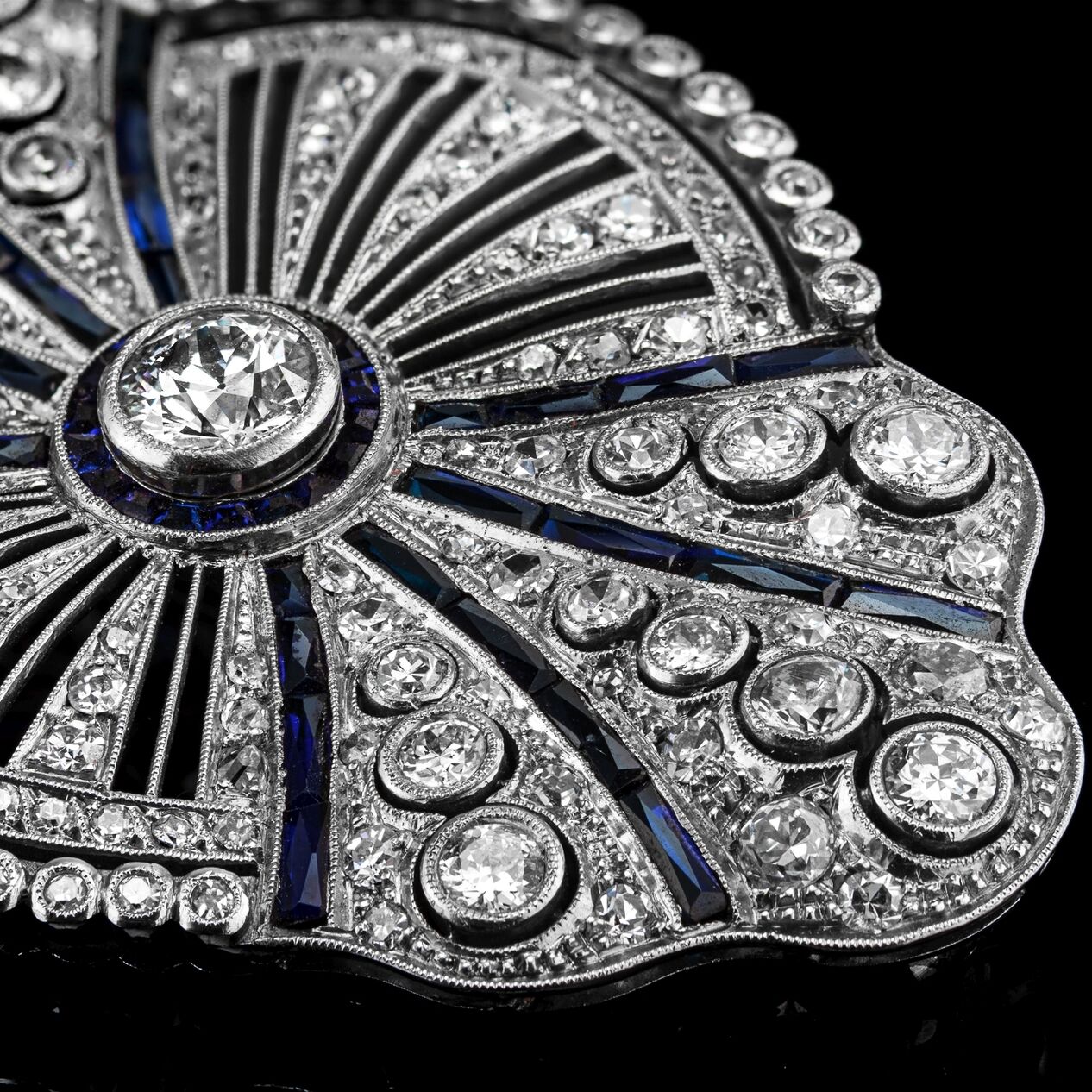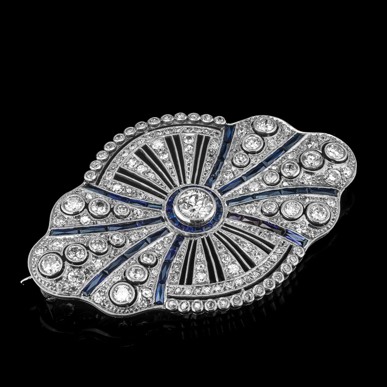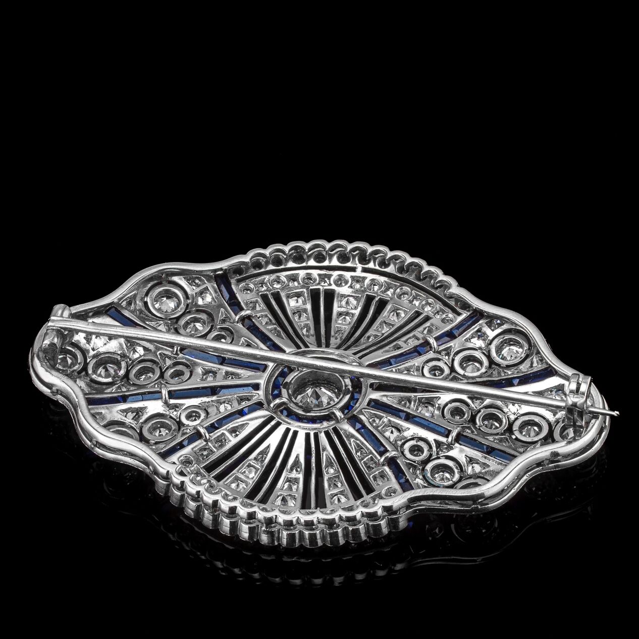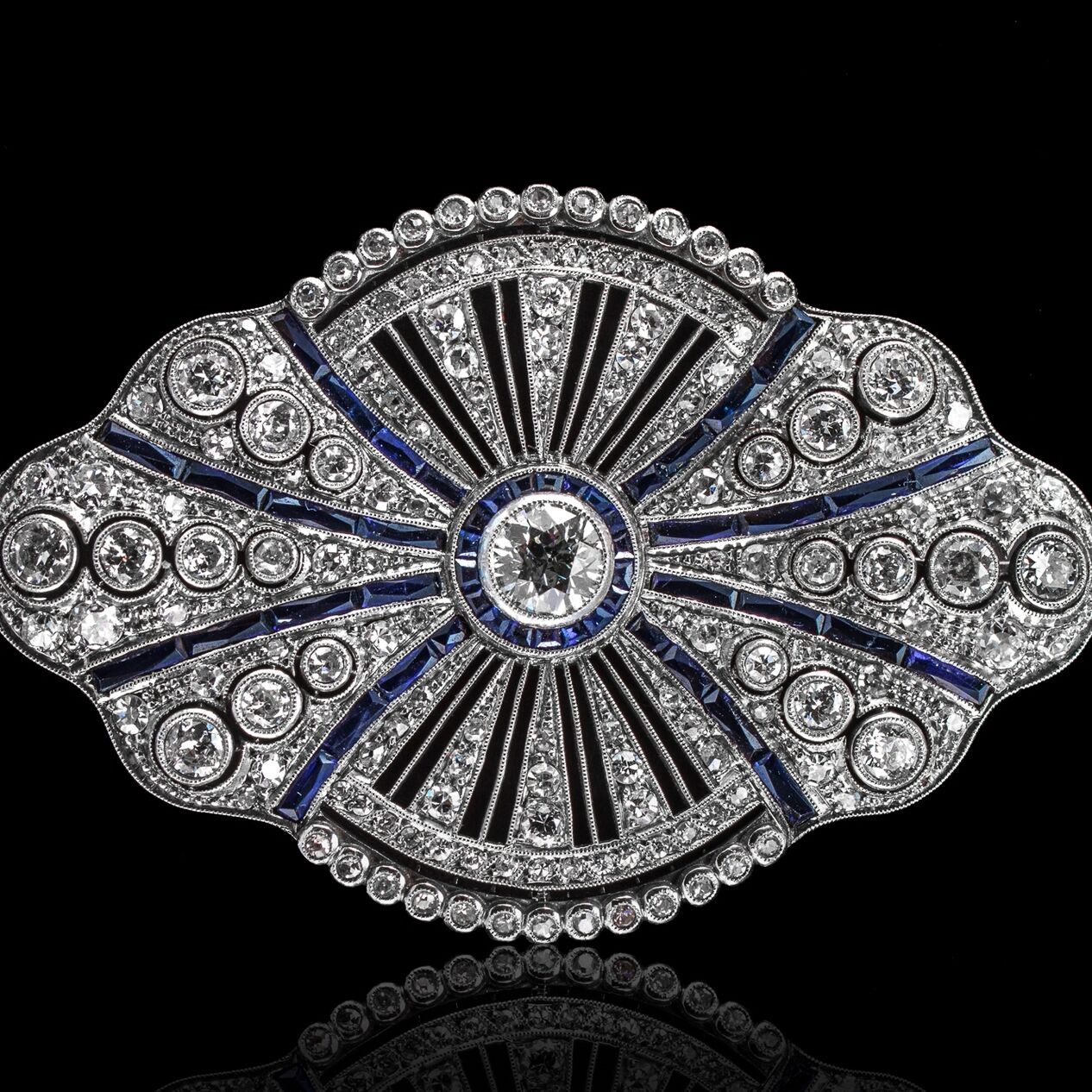 Unikalna dawna broszka Art Deco z lat 1920–1930. 159 diamentów (~3.75 ct) i 50 kalibrowanych szafirów, oprawionych w platynę. Prawdziwa perła biżuterii vintage, w doskonałym stanie zachowania.