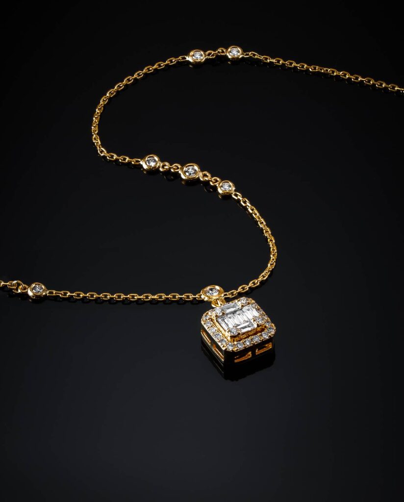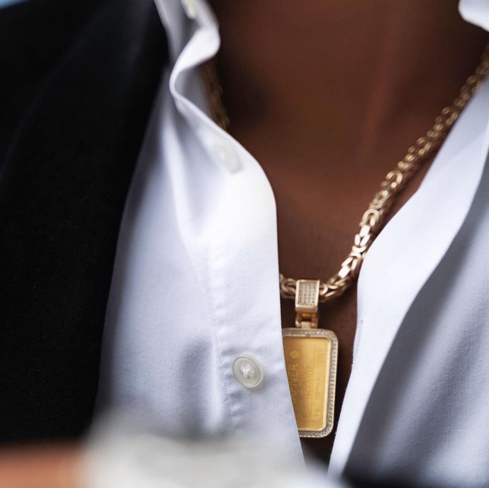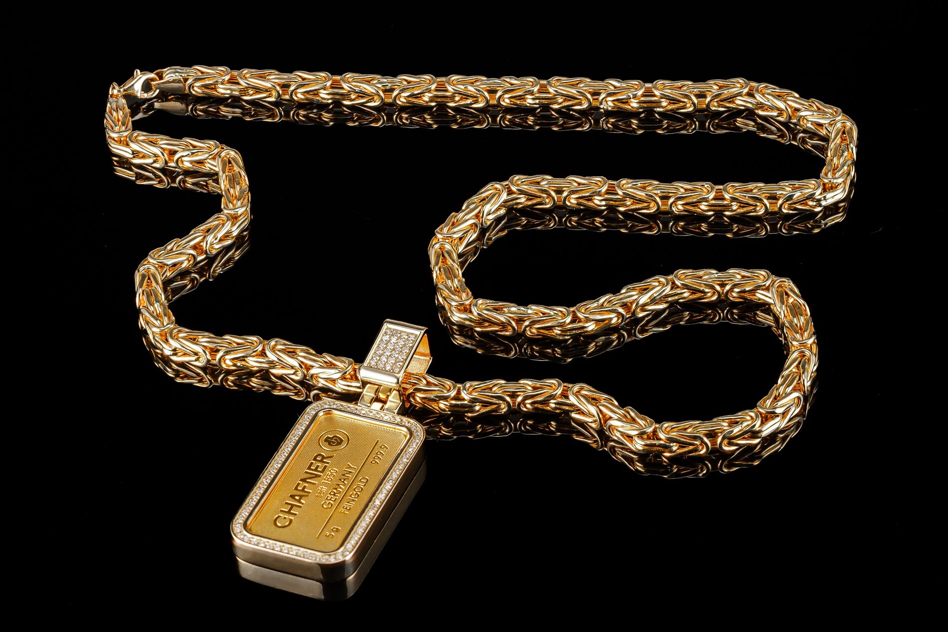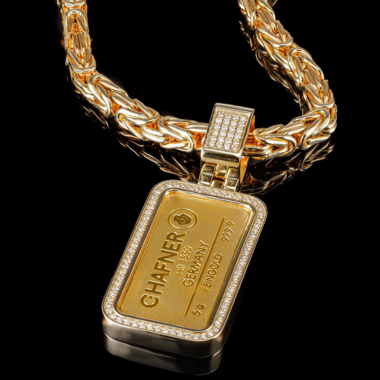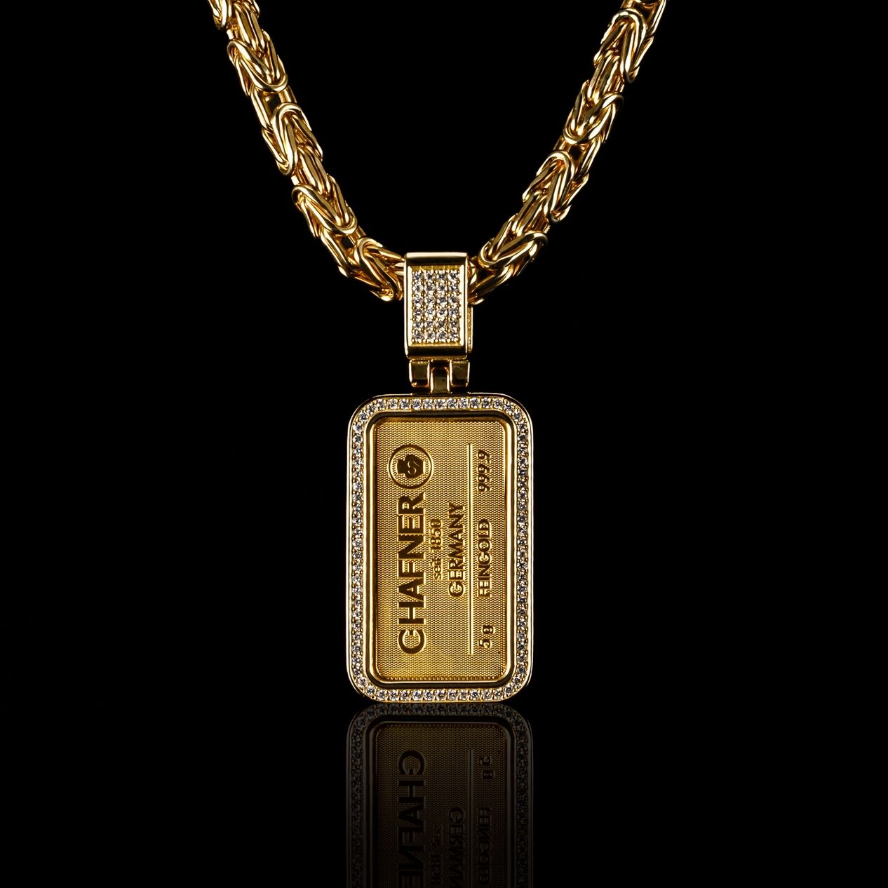 Centralnym punktem naszyjnika jest oryginalna sztabka złota CHAFNER, oprawiona w najwyższej jakości złoto 0.585 (14K), dodatkowo ozdobiona brylantami o łącznej masie około 1.00 ct. Diamenty nadają całości niepowtarzalnego blasku, a sama oprawa podkreśla wyjątkowość projektu.