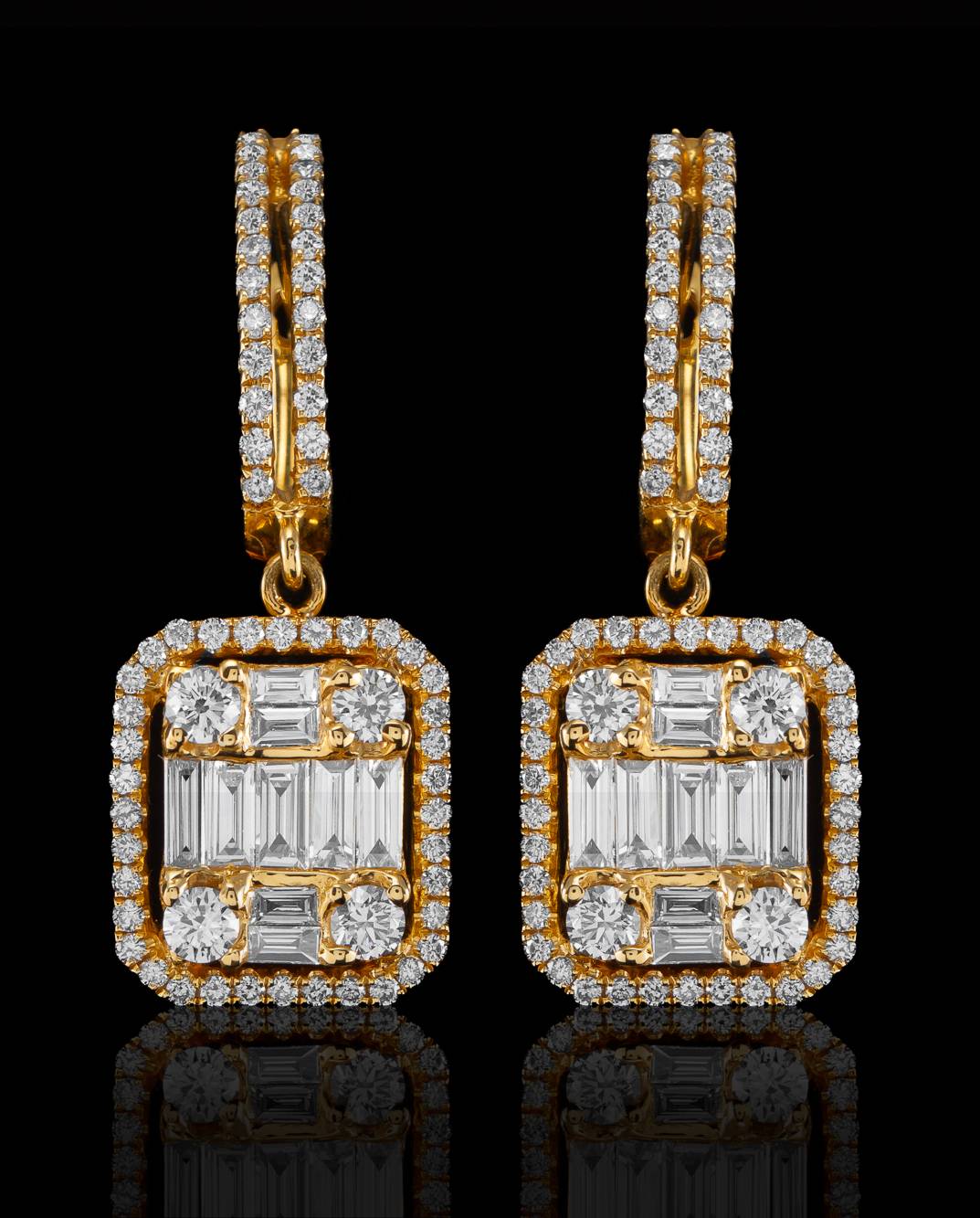 Każda para tych oszałamiających kolczyków z diamentami harmonijnie łączy w sobie 144 starannie selekcjonowane, kalibrowane diamenty o łącznej masie około 1.80 karata. Ta imponująca ilość kamieni szlachetnych jest układana w oprawie z dbałością o każdy detal, tworząc spektakularny efekt świetlny, który przyciąga spojrzenia i podkreśla wyjątkowość osoby je noszącej.