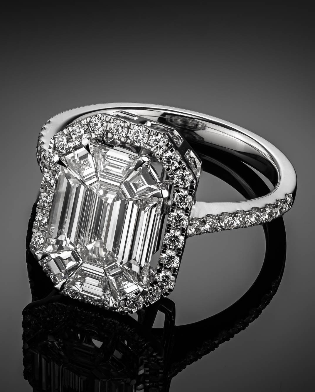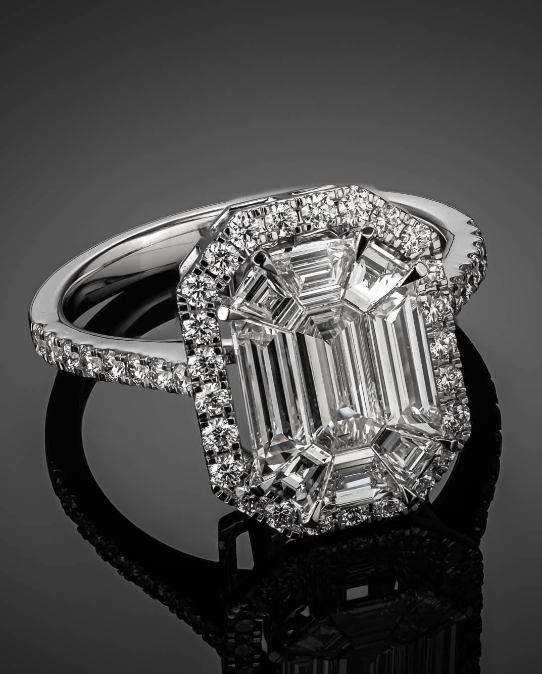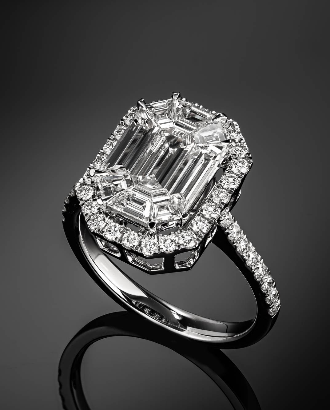 Każdy pierścionek jest inny i niepowtarzalny. Centralna część pierścionka, złożona z indywidualnie szlifowanych skalibrowanych ze sobą dużych diamentów składa się w jeden kamień o wyglądzie 5 karatowego diamentu.