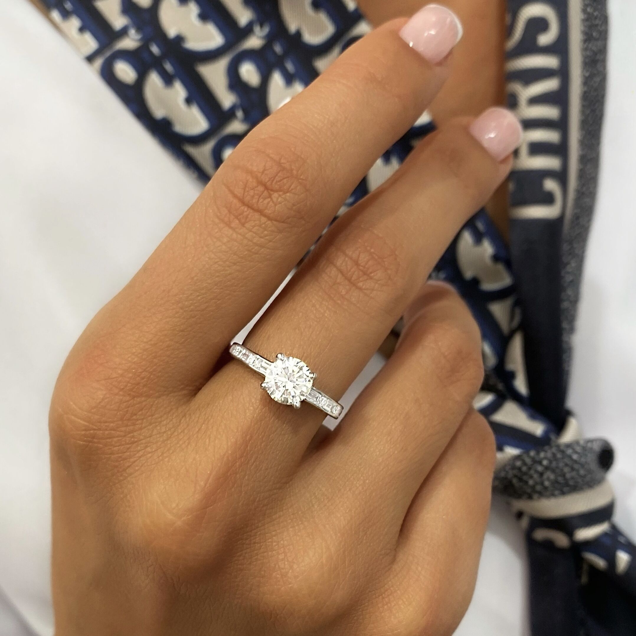 W centrum znajduje się certyfikowany brylant o masie 1.00 ct, otoczony 12 starannie kalibrowanymi diamentami bocznymi o łącznej masie około 0.34 ct. Kamienie osadzone są naprzemiennie w szlifie brylantowym (okrągłym) i bagietowym (prostokątnym), tworząc unikalną kompozycję.